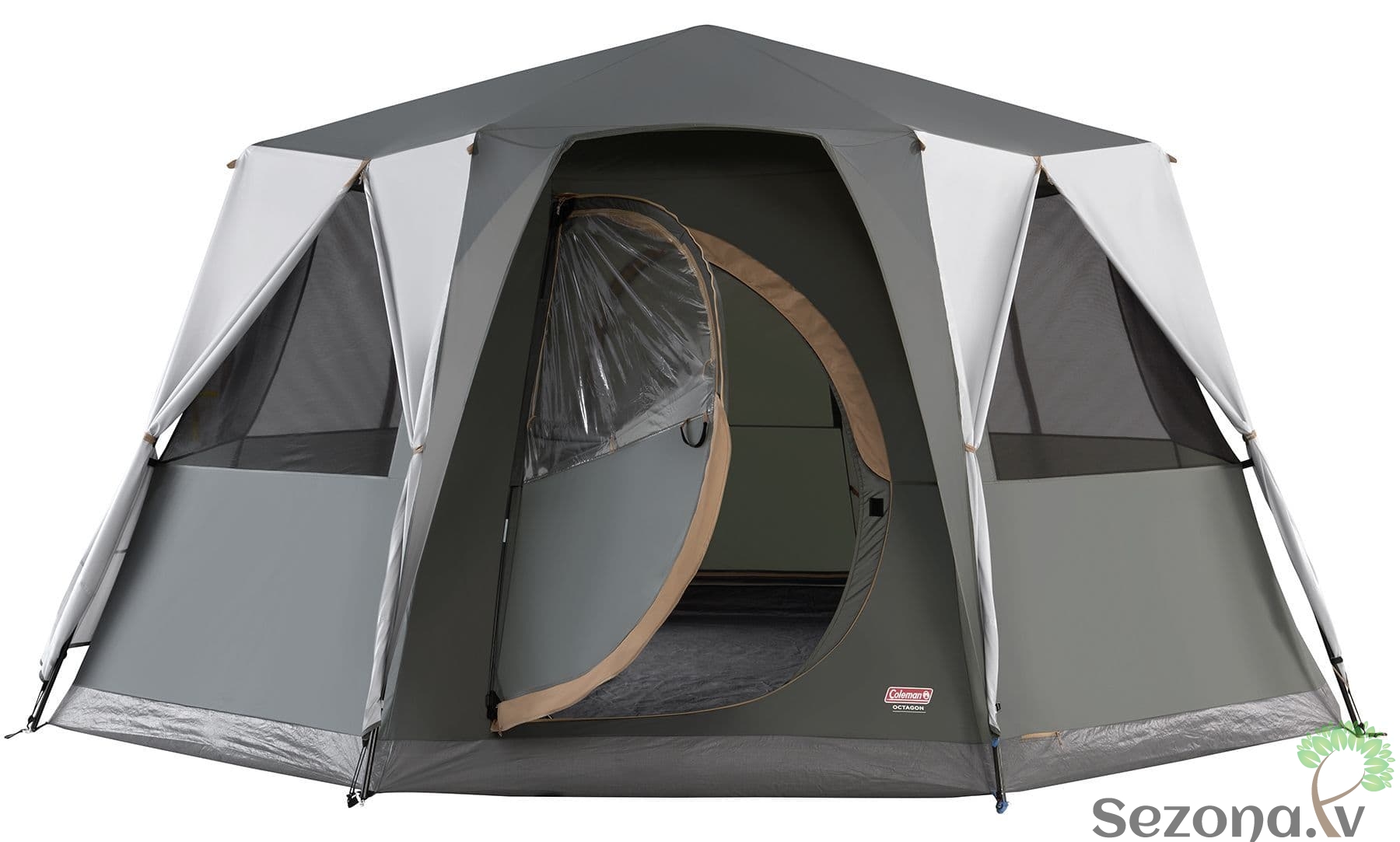 Coleman Octagon 8 Grey nodrošina pilnu 360° skatu uz apkārtni, ar plašu dzīves telpu un stingrām veramām durvīm, kas kempingā rada mājīgu sajūtu. Šai plašajai teltij ir daudz pielietojumu: to var aprīkot kā greznu guļamistabu, rotaļu istabu bērniem vai kā telti festivāliem, kur pulcēties ar draugiem. Lietus pārvalku var noņemt, pārvēršot Octagon 8 par vietu, kur uzturēties, kad esat vasarnīcā vai dārzā.