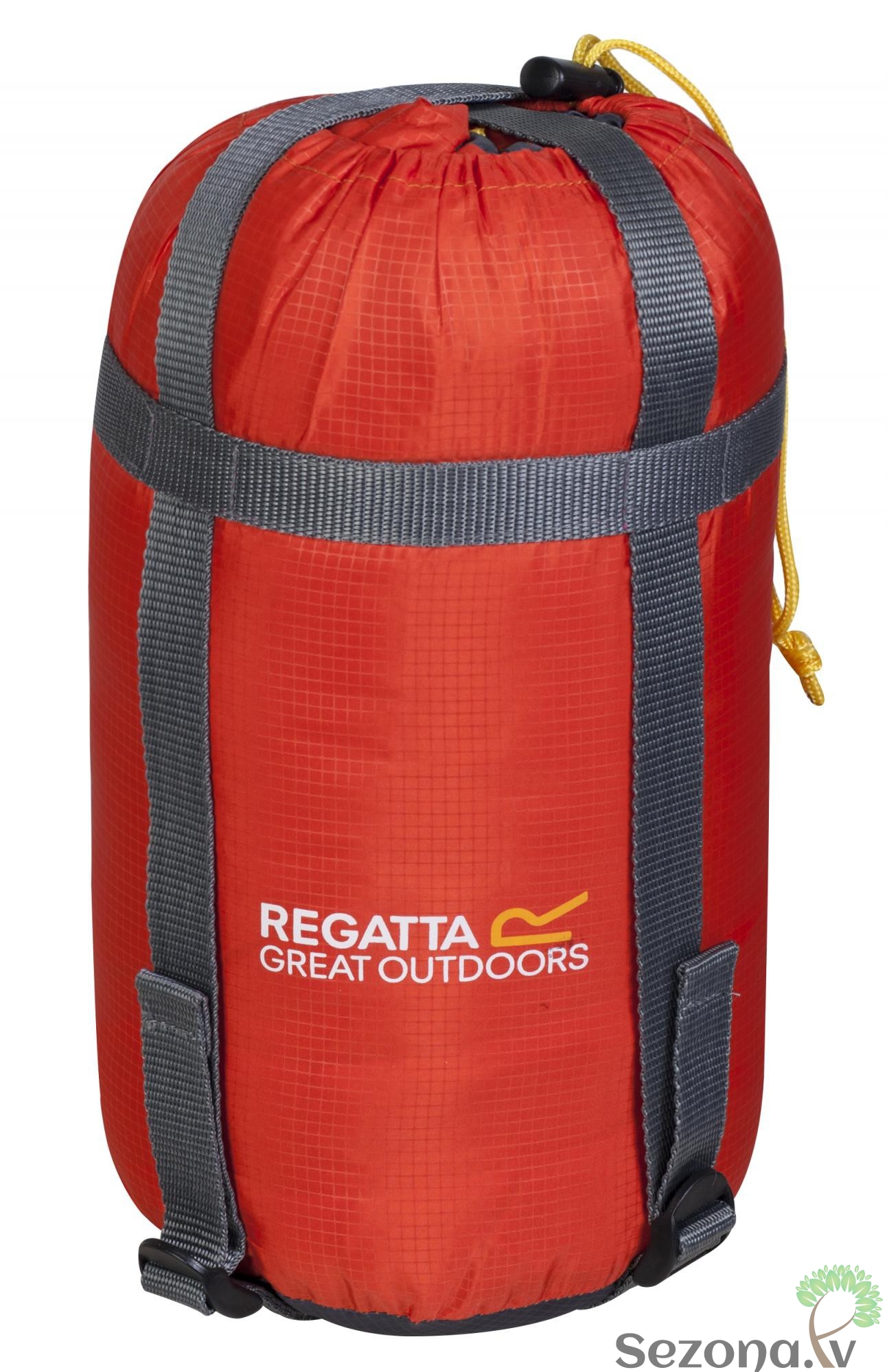 - Kompresijas soma vēl vairāk samazina sapakota guļammaisa izmēru