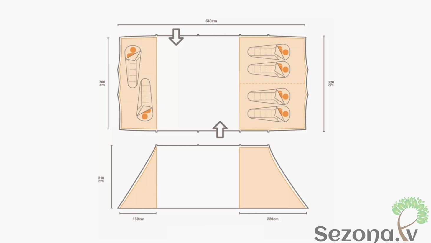 Ar Karuna 6 būsiet tuvāk dabai. Telts aprīkota ar divām ieejām. To iespējams arī sadalīt divās guļamtelpās, tādējādi iegūstot vairāk privātuma. Šī plašā telts spēj izmitināt 6 personas, nodrošinot komfortablu nakšņošanu.