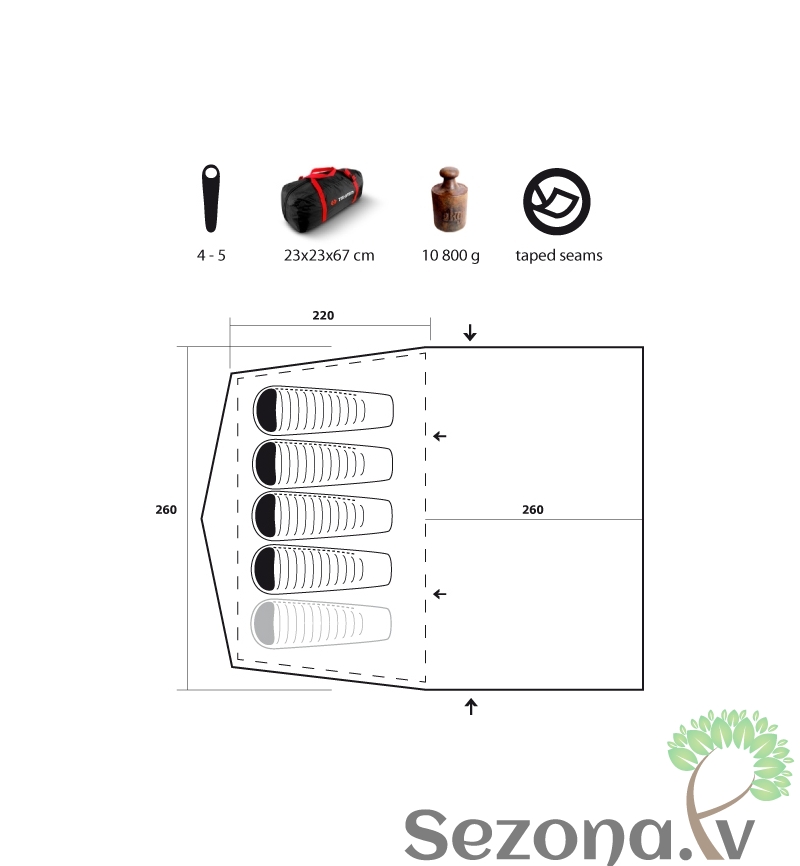 - Iekšējās telts materiāls: permeable WR 100 % PES