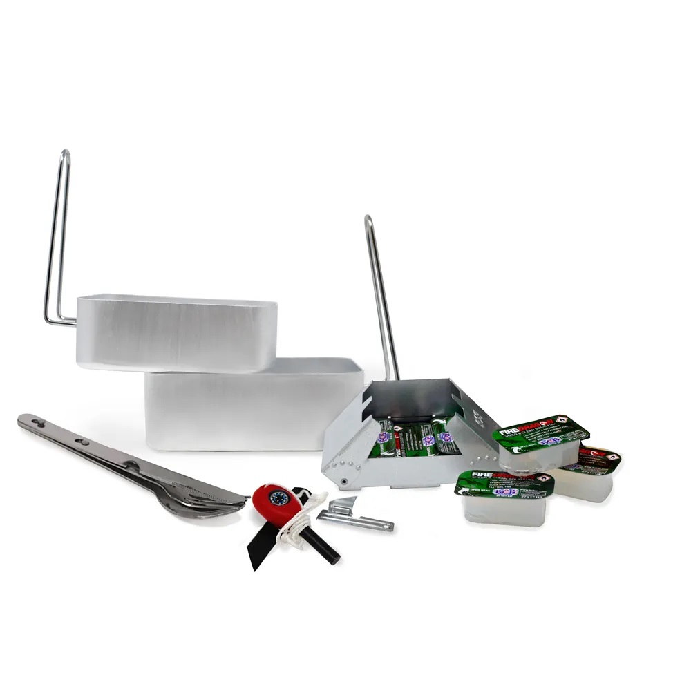 Pilnīgs gatavošanas komplekts, kas aprīkots ar dažādiem svarīgiem instrumentiem, lai pagatavotu gardu maltīti brīvā dabā.