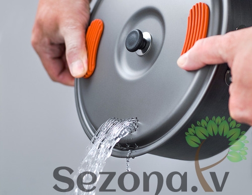 Liels ģimenes katls ar ērti nolokāmiem rokturiem. Izgatavots no anodizēta alumīnija. Katla vākā ir iestrādāti caurumi un speciāli nekarstoši īkšķu atbalsta punkti, lai būtu ērtāk nokāst uzvārītos produktus. Spirālveidīgs reljefs katla pamatnē nodrošina teicamu stabilitāti uz degļa.