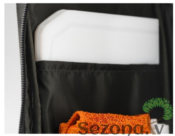 Santoku komplekts ar trīs dažādiem nažiem, dēlīti griešanai, pudelīti ziepēm un divpusēju trauku lupatiņu. Iepakots neilona somiņā.