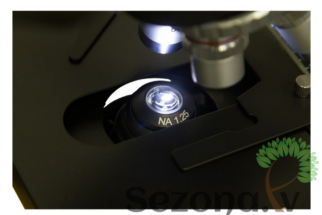 Mikroskops ir aprīkots ar revolvera uzliktni ar 4 objektīva lēcām. Komplektā ietilpst bezkrāsas objektīva lēcas ar dažādu palielinājuma spēku; vienas no tām ir imersijas tipa lēcas. Imersijas (iegremdēšanas) eļļas izmantošana ievērojami palielina ar mikroskopu apskatāmā objekta spilgtumu un paplašina palielinājuma limitu. Divi plašā lauka okulāri ir iekļauti komplektā – 10x okulārs un 20x Heigensa okulārs – lieliski papildina cits citu un sniedz iespēju veikt plaša spektra vizuālos novērojumus. Pilns mikroskopa palielinājuma spektrs ir 40x līdz 2000x.